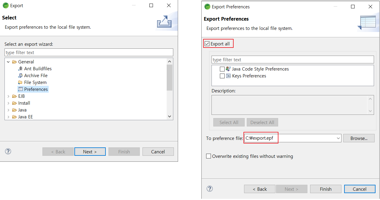 Version: 4.7.2.RELEASE Build Id: 202009020958 JDK 1.8 2023-11-03 기준 설치하면 자동으로 호환성 맞게 처리해주는 줄로 생각했는데 되는 게 있고 안 되는 건 수동설치하는게 낫다. JDK, 툴 버전이 높다면 문제가 없을 듯 보인다. 요약: 마켓에서 Mylyn을 제외하고 설치 or 수동 설치에서 Mylyn 제외, JavaHL을 하나만 선택하여 설치 Kakao mirror 서버로 접속하는 경우가 있던데 사내에서 접속 여부 확인 동일 버전의 툴을 테스트용으로 세팅하여 테스트 먼저 하고 적용할 것 1. 설정 내보내기 File - Export 최종 작업 후 File - Import 2. 자동 업데이트 해제 -> 영향은 없어보이나 검색 시 설정하라는 케이스도 있었음 여..